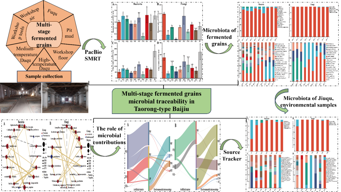 该研究以探究陶融型白酒多阶段酒醅微生物的来源以及多重生产环境对酒醅微生物群的贡献作用为目的。采用单分子实时测序技术对陶融型白酒多阶段发酵酒醅、酒曲以及酿造环境(空气、工具等)的微生物群落结构进行解析,并利用微生物溯源技术(Source Tracker)探究酒曲和环境对酿造菌群的贡献机制。研究表明,酒醅微生物群的组成和丰度的演替主要发生在入窖发酵7天后。溯源分析发现,堆积发酵前后酒醅的微生物群落主要来源于麸曲、中温曲和生产工具。而入窖发酵7天后,窖泥、生产地面和工具成为酒醅微生物群的主要贡献源。此外环境与酒曲微生物间的相互作用共同驱动了酒醅微生物群落的演替与发酵的进行。该研究为不同时期酒醅微生物群落起源和结构提供了新的见解,也为白酒等传统发酵食品的质量控制和标准化生产提供了有效的参考。