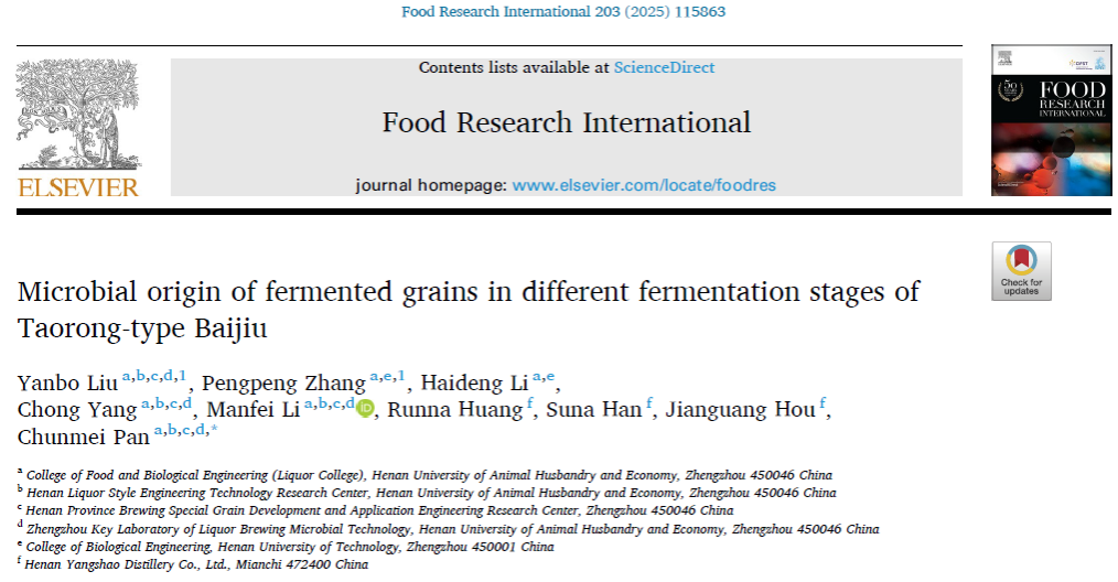 近日,我校酿酒团队师生在国际知名学术期刊《Food Research International》(中科院1区TOP期刊,IF:7)上发表了题为“Microbial origin of fermented grains in different fermentation stages of Taorong-type Baijiu”的研究型学术论文。食品与生物工程学院副教授刘延波和联合培养的硕士研究生张朋朋为共同第一作者,潘春梅教授为通讯作者,我校为第一署名单位和通讯单位。该研究得到了河南省重点研发专项(河南白酒生态酿造关键技术研发与示范应用)和食品科学与工程校级重点学科项目资助支持。