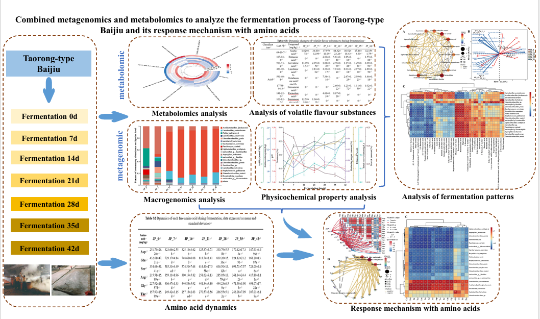近日,我校食品与生物工程学院(酒业学院)酿酒团队师生在中科院SCI1区Top期刊《Food Chemistry: X》(IF:8.2)上发表了题为“Combined metagenomics and metabolomics to analyse the fermentation process of Taorong-type baijiu and its response mechanism with amino acids”的研究论文。刘延波副教授及其联合培养的硕士研究生张朋朋为共同第一作者,潘春梅教授为通讯作者,我校为第一署名单位和通讯单位。