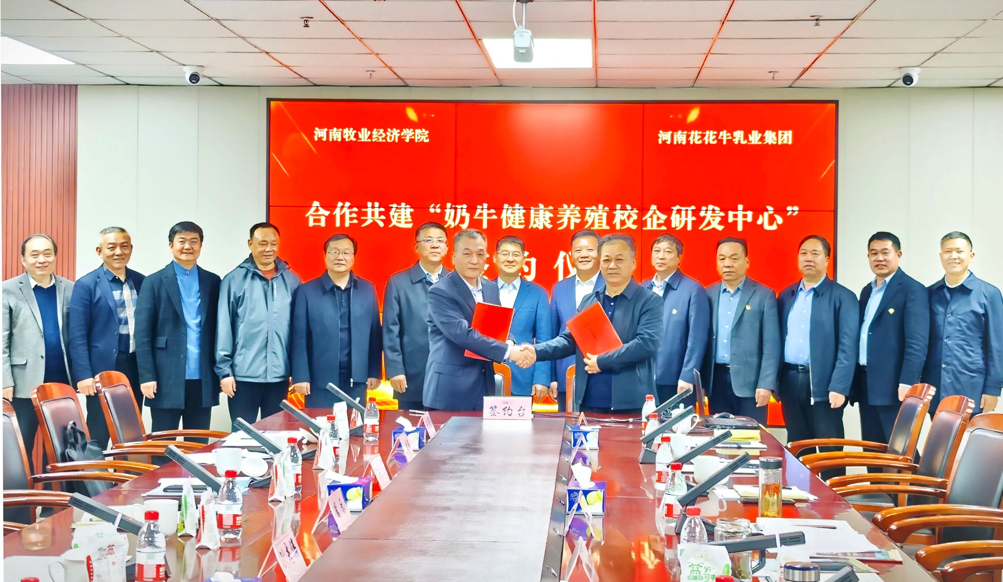 副校长席磊、河南花花牛乳业集团总经理杨永代表双方签定了共建奶牛健康养殖校企研发中心合作协议。双方将重点围绕科研攻关、技术创新、成果转化、人才培养等方面开展全方位深度合作。