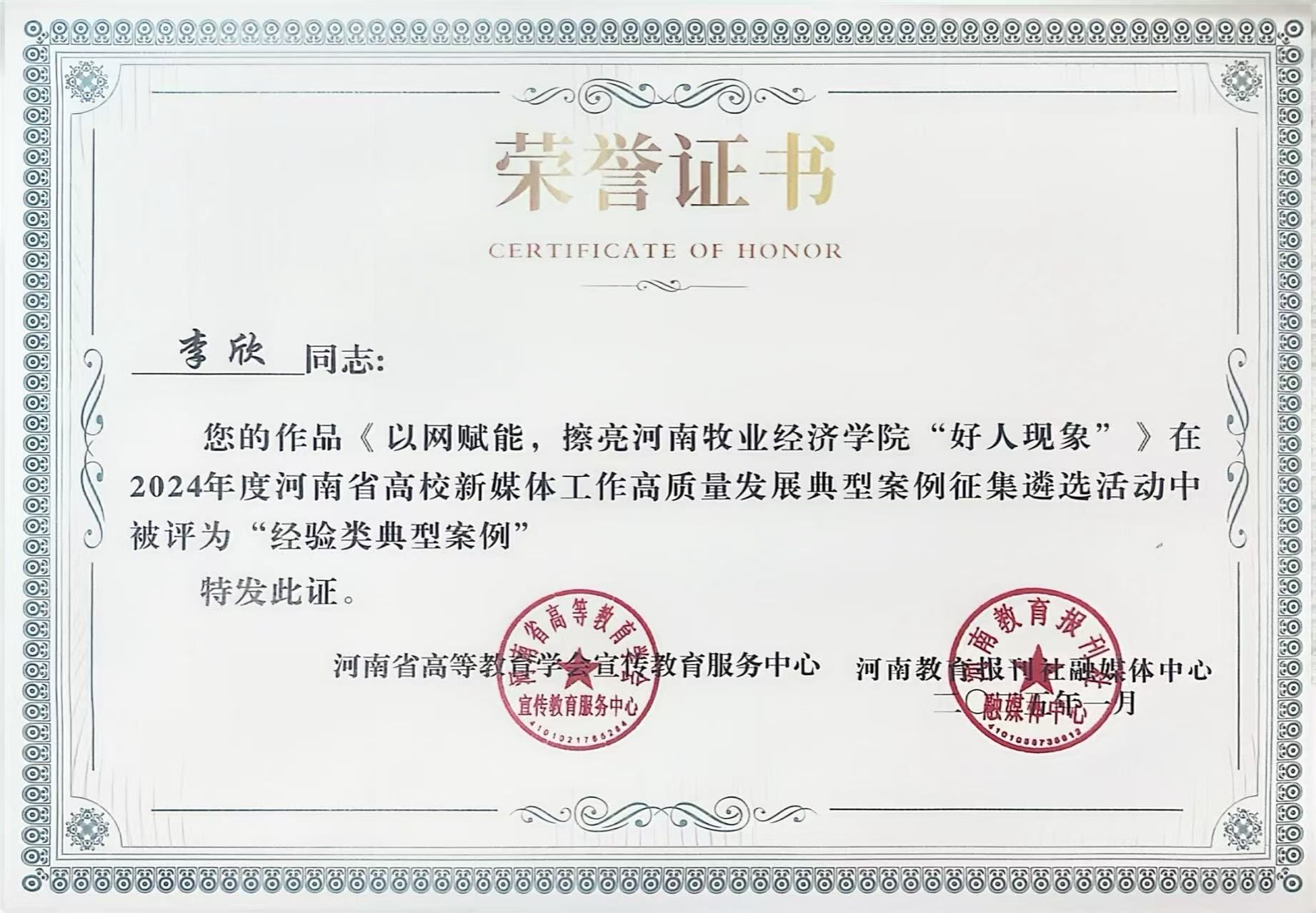 近日,在2024年度河南省高校新媒体高质量发展典型案例遴选活动中,我校党委宣传部报送的《以网赋能,擦亮JIANGNAN.COM“好人现象”》获评工作好经验类典型案例,1人入选人物类典型案例,展现了学校近年来充分运用融媒体深入开展网络思想政治教育的探索与成效。
