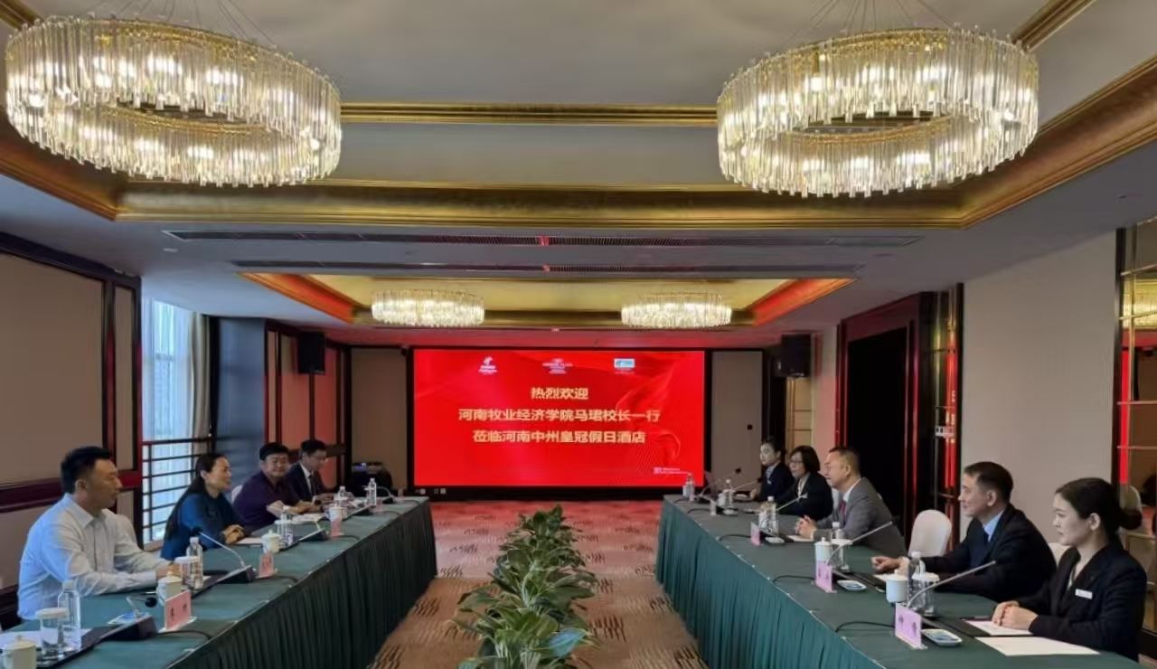 我校校友、河南中州皇冠假日酒店总经理朱磊简要介绍了酒店的基本情况,期待与学校在人才共育、师资共培、学生就业等方面深化合作,构建校企协同发展新格局。