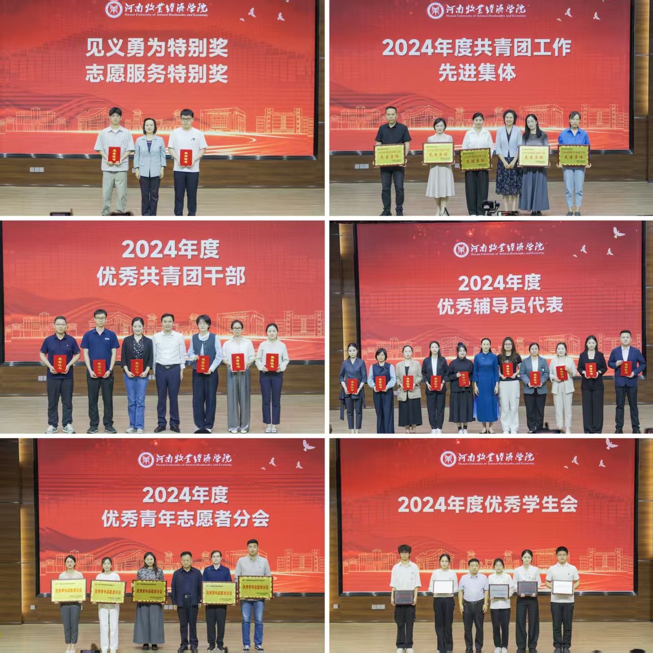 与会领导分别为2024年度学生工作先进单位、共青团工作先进集体,优秀共青团干部、辅导员代表,优秀学生会、青年志愿者分会、十佳社团、十大青年志愿者模范以及第二届国家奖学金标兵、国家励志奖学金、第八届校级学生专项奖和百名学业之星、考研“学霸宿舍”、优秀考研学子代表颁奖。尹新明为物流与电商学院罗竣文、食品与生物工程学院(酒业学院)朱赞文两名同学分别颁发见义勇为特别奖和志愿服务特别奖。