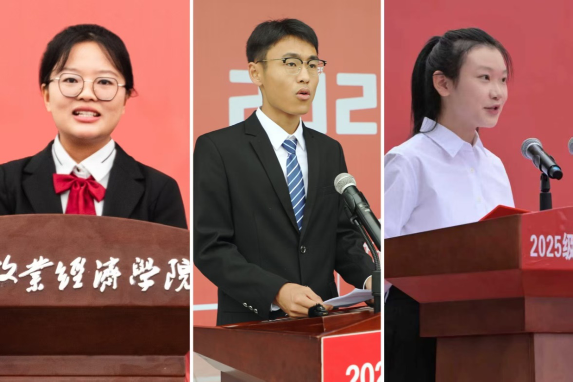 食品与生物工程学院(酒业学院)2025级食品科学与工程05班秦梓涵(左)、经济与贸易学院2025级经贸02班翟卿菡(中)、能源与智能工程学院2025级自动化01班于倡浩(右)作为新生代表发言