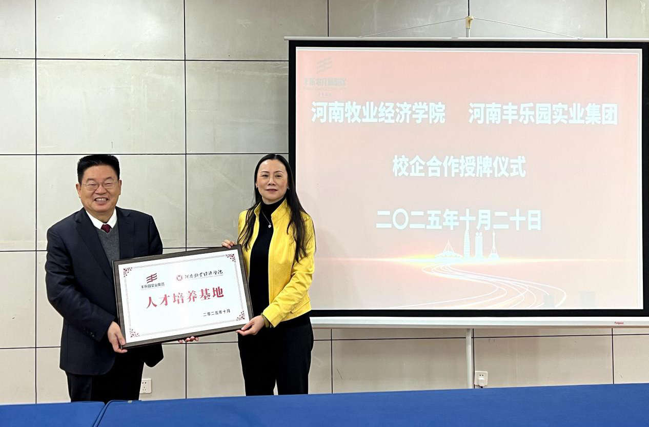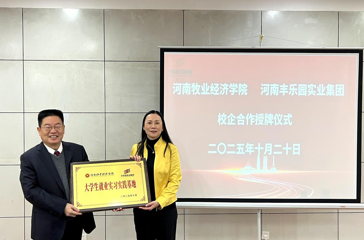 会上,校企双方举行了校企合作授牌仪式。马珺代表学校授予河南丰乐园实业集团有限公司“大学生就业实习实践基地”牌匾,河南丰乐园实业集团有限公司授予学校“人才培养基地”牌匾。与会人员就人才共育、横向课题、学生就业实习等工作展开深入交流,并达成诸多共识。