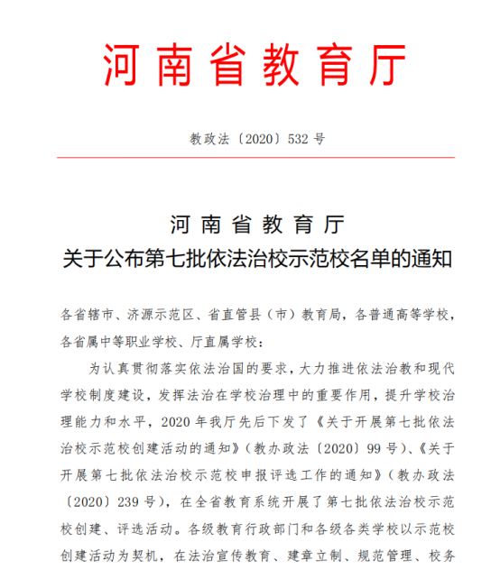 近日,省教育厅发布《河南省教育厅关于公布第七批依法治校示范校名单的通知》(教政法〔2020〕532 号),我校被评为“依法治校示范校”。