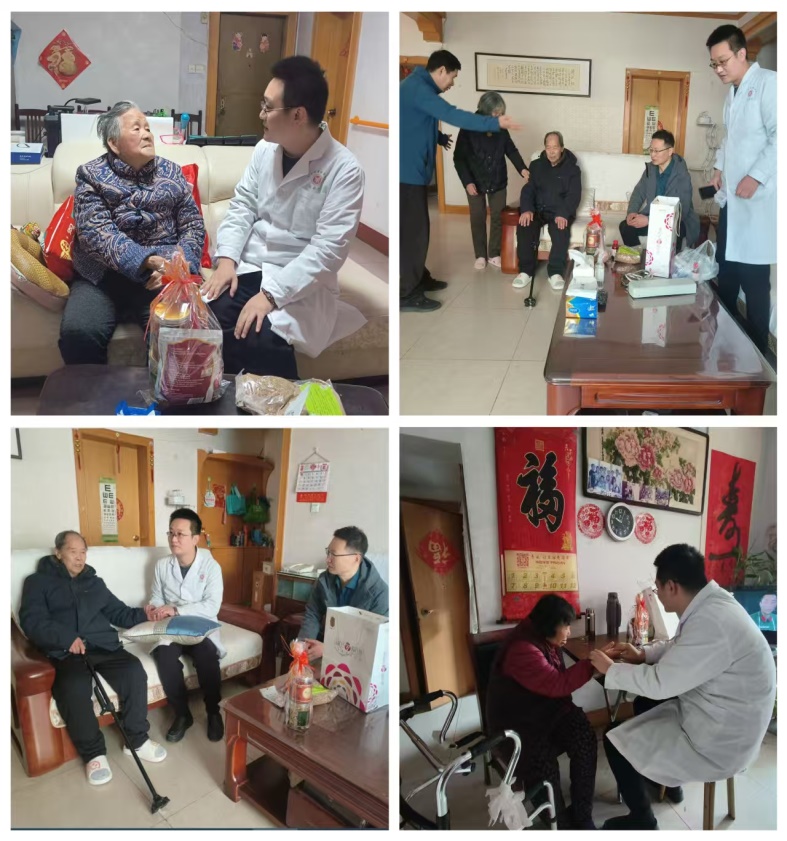 离退休职工工作处及校医院医务人员组成的慰问组带上物资以及医疗设备登门走访。大家与离退休老干部促膝交谈,详细询问他们的身体状况和生活起居情况,耐心倾听他们的健康诉求,叮嘱离退休老干部保持积极乐观心态和健康的生活方式,并现场为他们测量血压、把脉问诊。