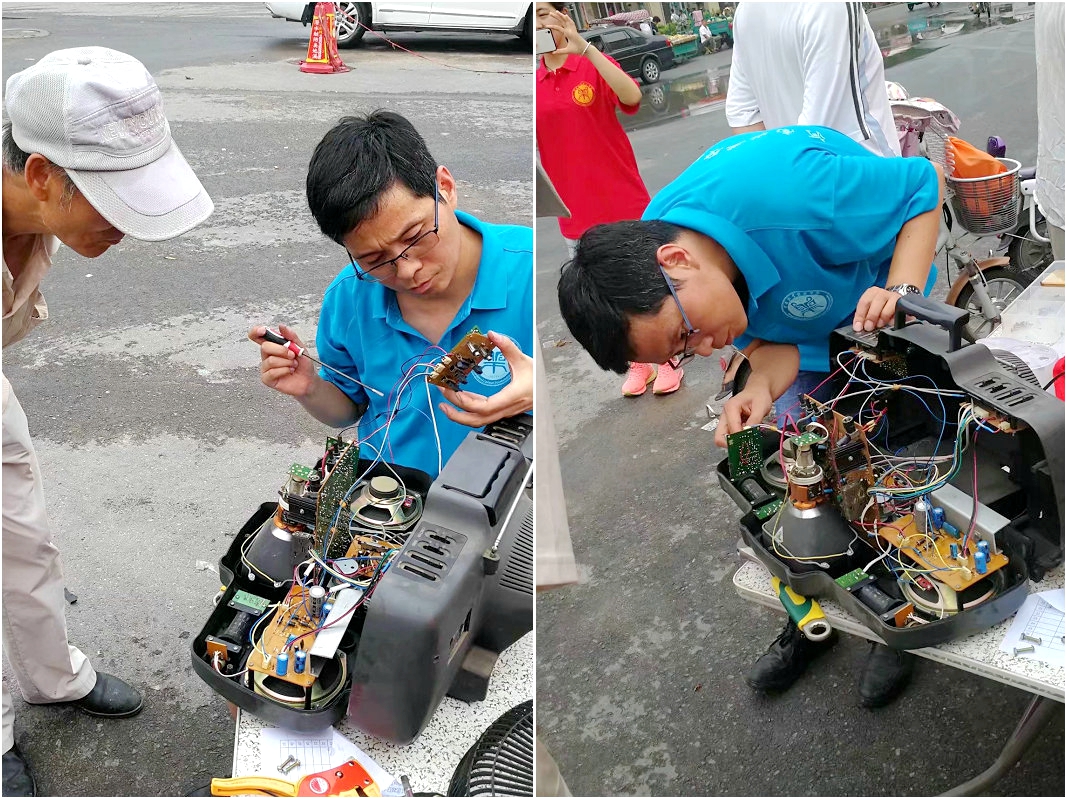 活动期间,买菁菁和孙汉卿两位老师带领同学们以饱满的热情投入到社区服务中。他们发挥自身专业和技术优势,相互配合、忙而不乱,不畏炎热酷暑,为市民们免费检测、维修家用电器300余件。看着学生志愿者们认真投入的身影,一位市民笑着说:“大学生有文化有技术就是好,我们这些电器坏了虽然有的自己能看懂,但是在技术上还是什么都不会,生活中这些高技术的工作真是难以解决”。暑期家电维修社会实践活动,不仅为同学们提供了投身社会、服务民生的机会,而且提高了大家的操作技能和专业素养。