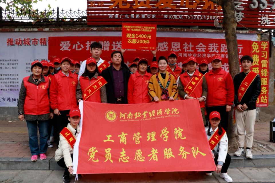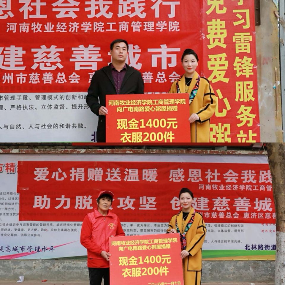 为深入贯彻党的十九大和全国“两会”精神,践行“奉献、友爱、互助、进步”的志愿服务精神,发挥党员示范引领作用,用实际行动践行社会主义核心价值观,1110日,工商管理学院学生党支部党员志愿者在院党总支委员、学生第一党支部书记周倩的带领下联合“四月天”青年志愿者协会,与惠济区慈善超市共同开展了“脱贫攻坚齐助力爱心捐赠暖人心”活动,将爱心义卖报纸所得善款与200件棉衣捐赠给广电南路爱心粥屋,助力脱贫攻坚,关爱城市弱势群体。