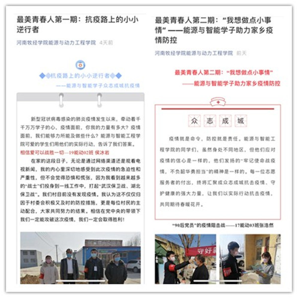 疫情就是命令,防控就是责任。该院学生党支部全体师生们,虽然身处不同地区,但他们应对疫情的信心是一样的,他们发扬的“牢记使命战疫情,不负韶华勇担当”的精神是一样的。每一位师生志愿服务者的付出,终将汇聚成众志成城抗击疫情、守护健康的强大力量,让我们以实际行动抗击疫情,共同期待春暖花开,相聚校园!(能源与智能工程学院 张彤)