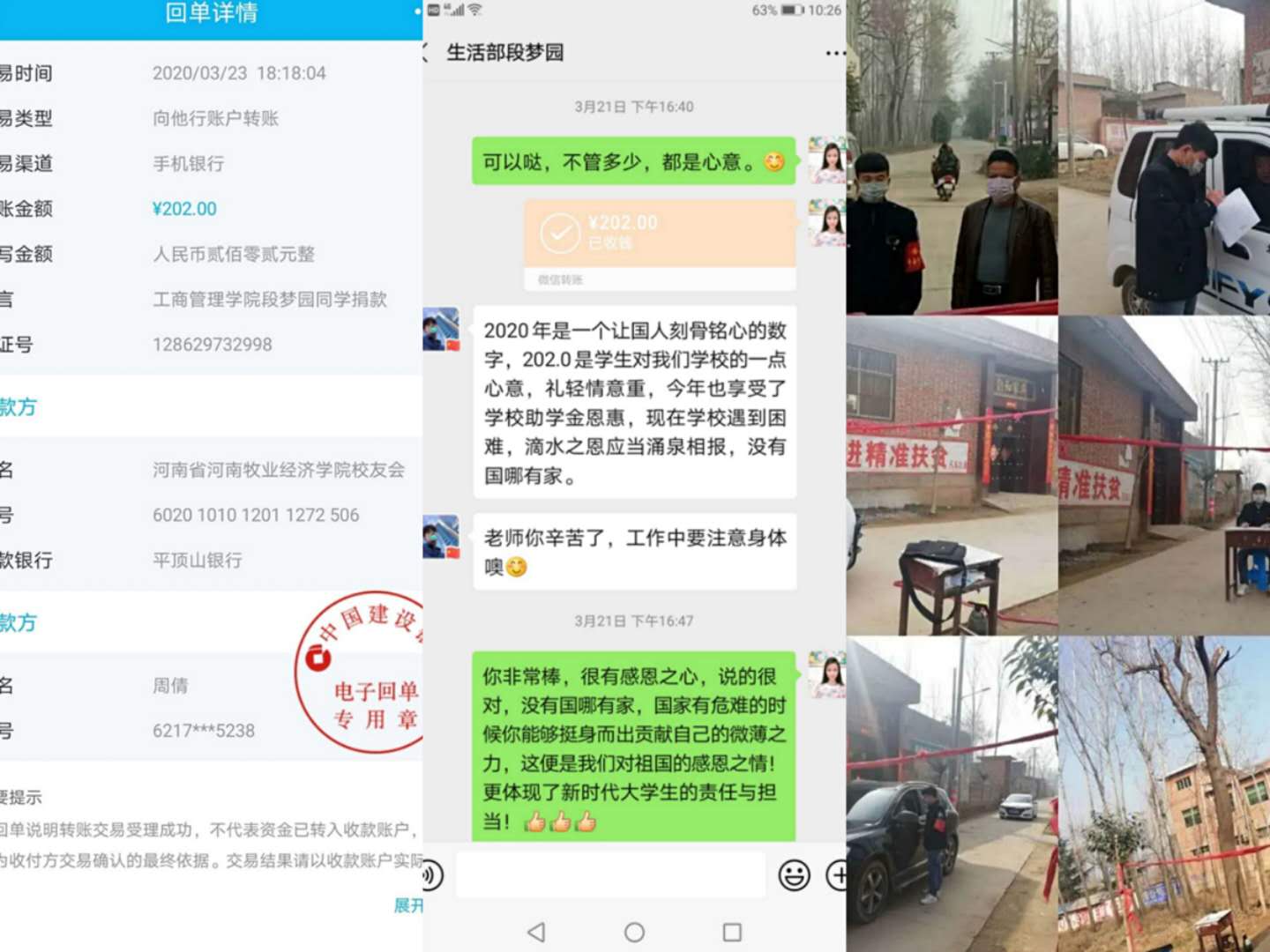 3月22日,该院19级连锁经营管理01班的段梦园同学为学校疫情防控工作捐款202元,以表达对学校的支持与感激。段梦园同学表示:“我享受到了学校助学金的恩惠,现在学校物资短缺,滴水之恩应当涌泉相报。”此外,段梦圆同学于2月25日至今,一直坚守在其家乡的抗疫志愿服务岗位上,为家乡的基层防疫工作尽心尽力,他始终秉持着“没有国哪有家”的信念,积极行动,助力抗疫。