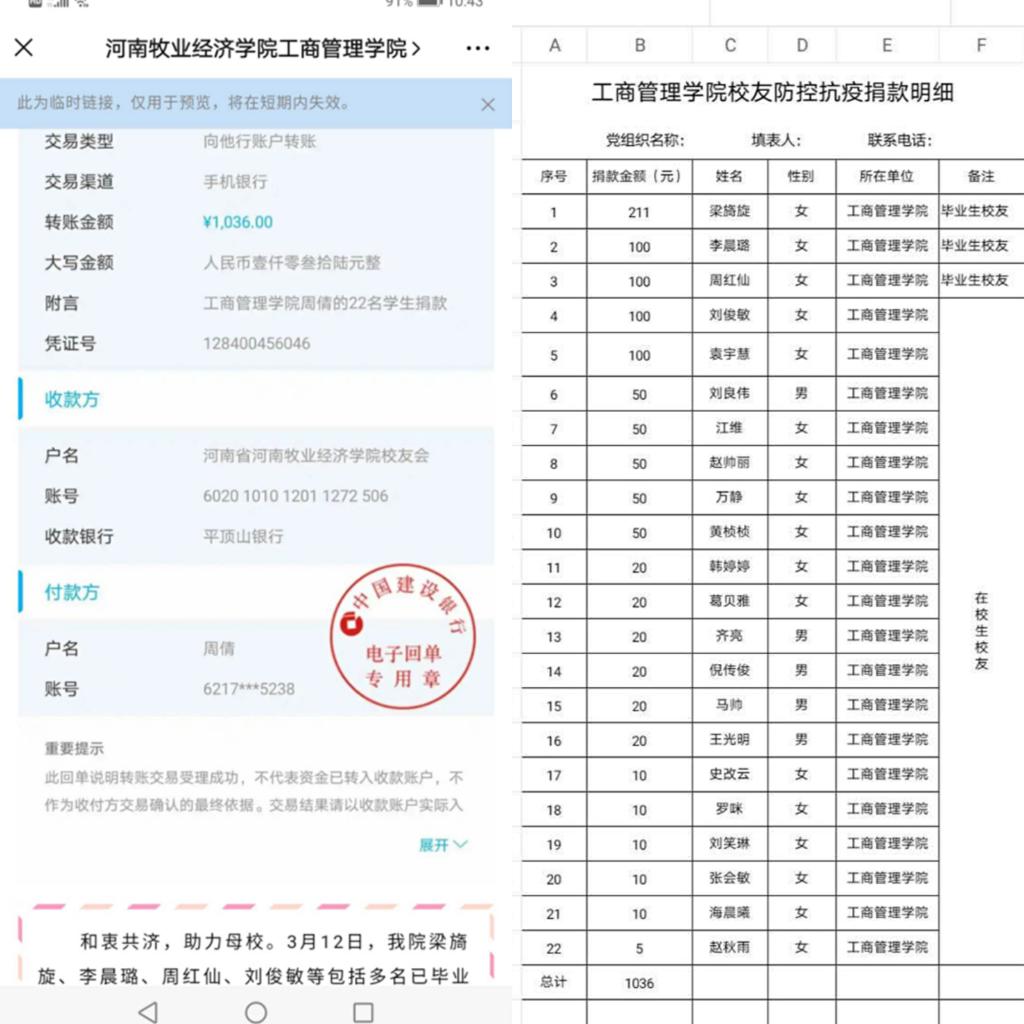 3月12日,该院毕业生校友梁旖旋、李晨璐、周红仙和在校生校友刘俊敏、袁宇慧等22名同学,在得知校内防疫物资短缺后,主动请求向学校捐款,在校学子与毕业学子心系母校齐合力,一个个充满爱心与担当的红包纷纷涌入了学校爱心捐款的账号,共计1036元。“众人拾柴火焰高,相信每人都出一份力,我们一定能够打赢这场疫情防疫狙击战。”捐款学子们说。病毒无情,人间有情,爱心捐款捐赠的不仅仅是金钱,更是该院学子们奉献母校的责任与担当!