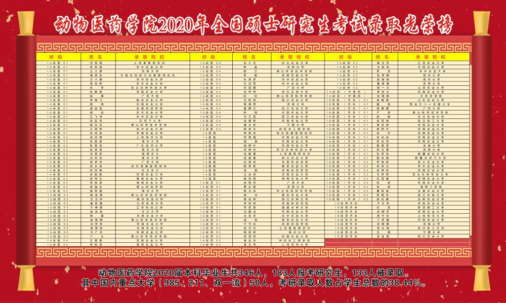 在今年的研究生考试中,该学院还出现了四个“学霸班”和三个“学霸宿舍”。被称为“学霸班”的2016级动物医学04班、动物医学01班、动物药学02班和2018级动物药学(专升本)班,考研率约占班级人数的50%,特别是动物医学04班26人参加了国家研究生入学考试,21人达到国家最低控制分数线,19人已确定被录取,录取率占班级人数的59.38%。