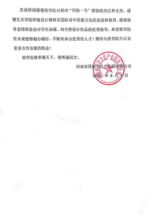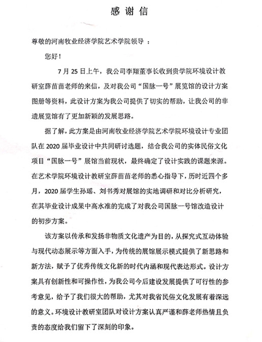 近日,艺术学院环境设计专业瓮淼老师、薛苗苗老师分别指导的毕业设计相继得到媒体报道和公司的致谢。瓮淼老师带领学生对南阳市社旗县大冯营镇“美丽乡村”建设规划设计的事迹相继被南都晨报和社旗头条等新闻媒体报道并转载。薛苗苗老师指导的实体项目郑州“国脉一号”展馆改造设计方案得到了河南省国脉文化产业园有限公司的肯定并发来感谢信。