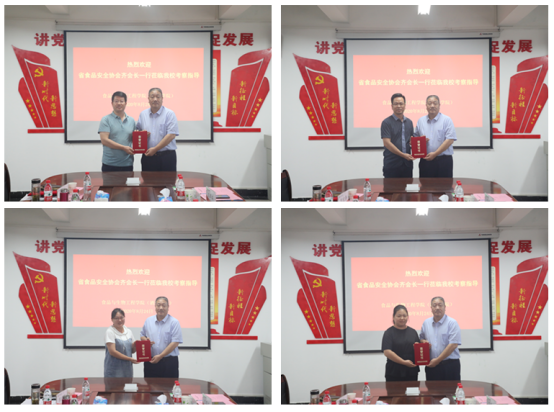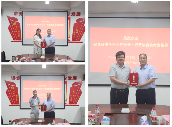 8月24日,河南省食品安全协会会长齐天生、专家委员会处长王科敏等一行9人到我校食品与生物工程学院进行考察交流,洽谈校会合作事宜。食品与生物工程学院党委书记赵安勇、院长潘春梅、副院长岳晓禹以及相关专业教研室主任、博士等参加了座谈会,院长潘春梅主持会议。