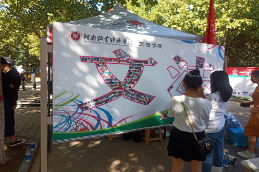 迎新现场弥漫着喜庆的氛围。文法学院用条幅表达对新生的热切期盼和热烈欢迎;在颇具特色和创意的展板上,375名新生照片拼成了“文法”字样,拉近了新生与学校的距离,表达了同学们与学校心连心。